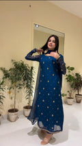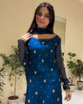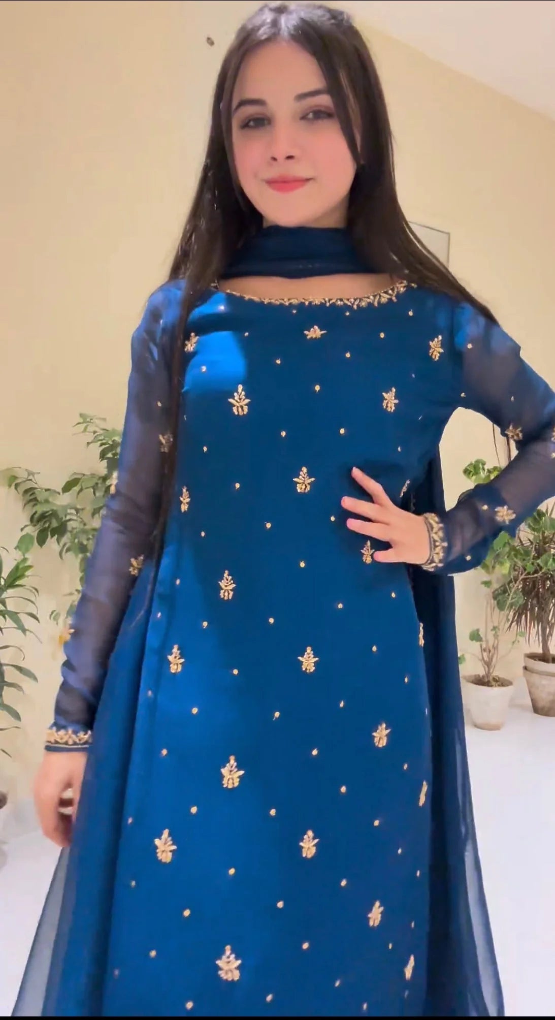 Elevate your festive wardrobe with this beautifully crafted chiffon ensemble. The dress features a fully handmade chiffon front and delicately handworked chiffon sleeves, showcasing true artisan detail. Paired with a soft chiffon dupatta finished with lace and a plain silk trouser, this outfit delivers effortless elegance for any occasion.