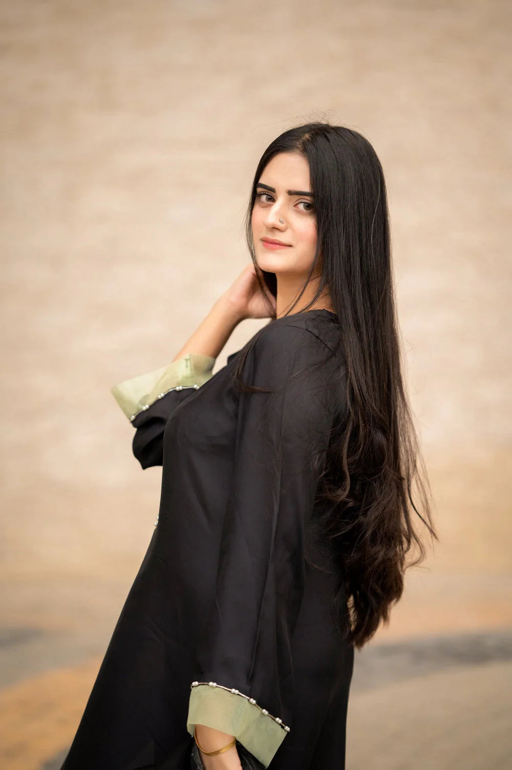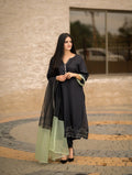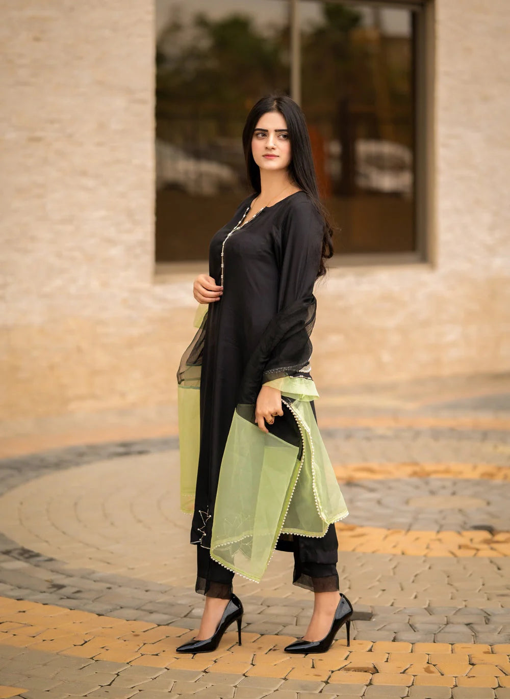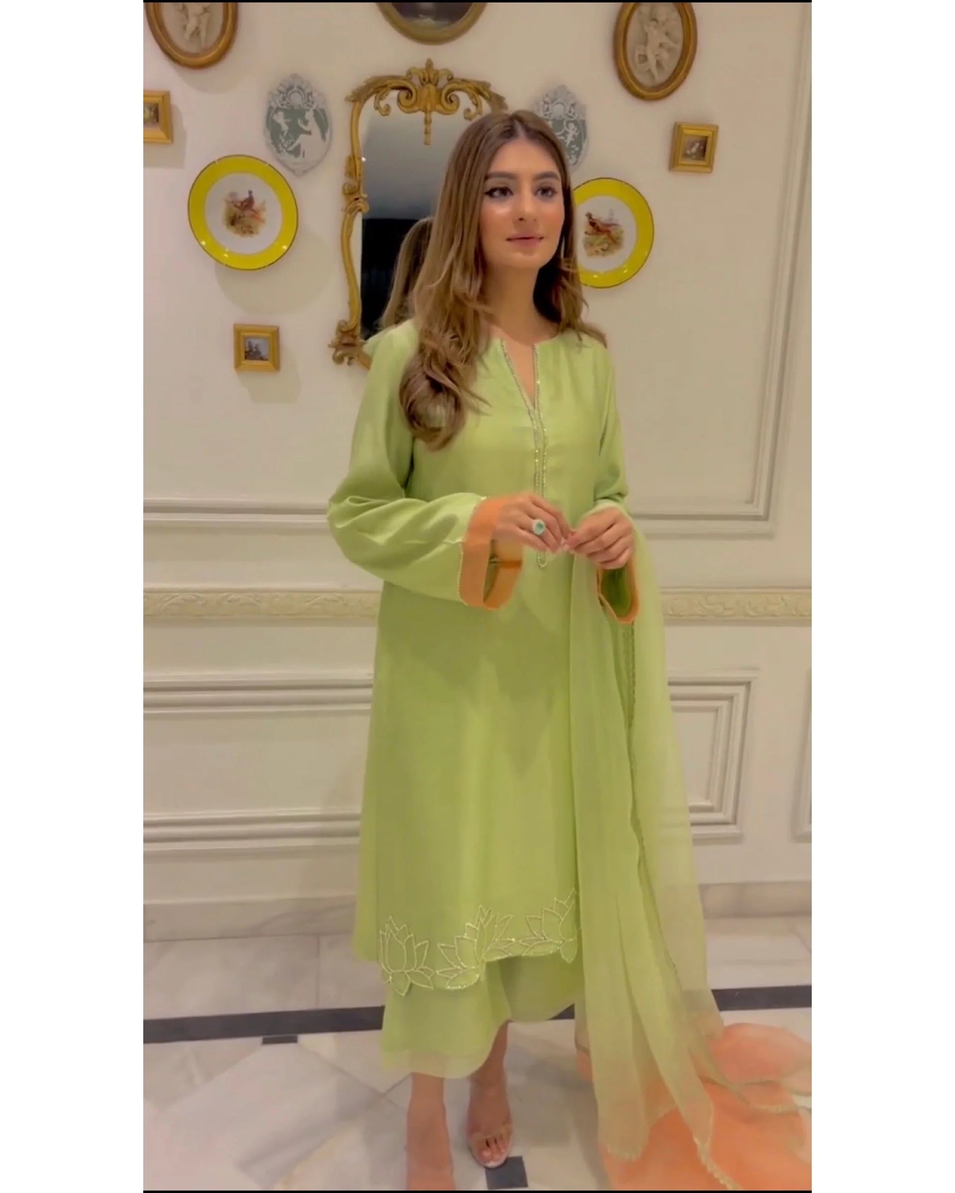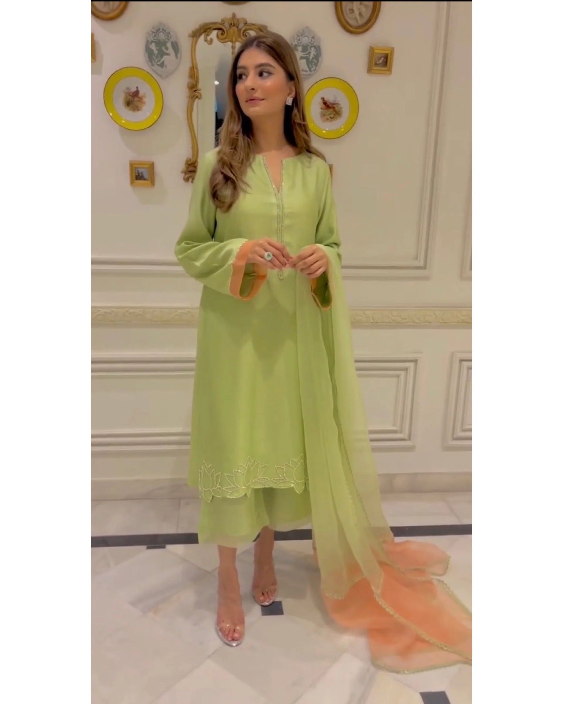 Designed for moments that call for understated luxury, this silk ensemble is finished with exquisite handwork throughout. The silk dress features a fully handmade front and sleeves, highlighting fine craftsmanship and timeless detail. A soft organza dupatta trimmed with lace adds a graceful, airy finish, while the plain silk trouser completes the look with quiet sophistication. Perfect for festive evenings, weddings, and refined gatherings.